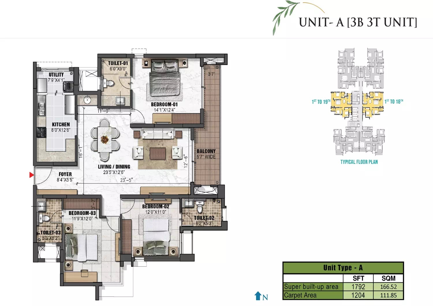 Bedrooms: 3 Bathrooms: 3 Super Area: 1800Sq. Feet.